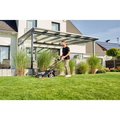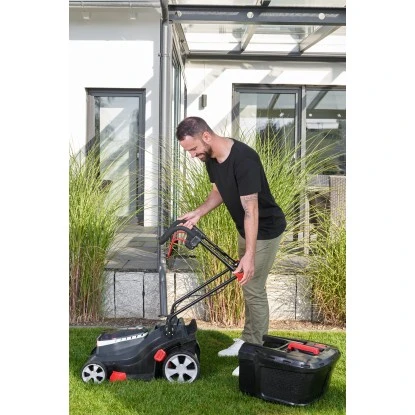 Dank des Kunststoffgehäuses wartet der Mäher mit einem geringen Gewicht auf und ist durch seine hohe Wendigkeit sowie der Schnittbreite von 38 cm ideal geeignet, um kleinere Gärten zu pflegen. Der 18 V Lithium-Ionen-Akku sorgt dabei für ein effizientes Arbeiten auf Rasenflächen mit bis zu 300 m².