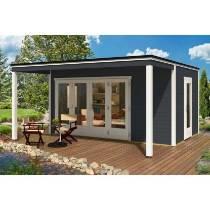 Im Lieferumfang des Gartenhauses sind ein Massivholzdach aus Nut- und Federbrettern, ein stabiles Eckpfostensystem in moderner Optik, Verglasung bei Türen aus Isolierglas, ein hochwertiges Falttür-Element zum kompletten Öffnen, eine hochwertige Einzeltür mit Glas, eine hochwertige Türschwelle aus Aluminium, imprägnierte Fundamenthölzer, ein Schloss, eine Drückergarnitur und Montagematerial enthalten. Die Lieferung erfolgt ohne Dachpappe und das Gartenhaus wird in naturbelassenem Zustand ohne Farbbehandlung geliefert.