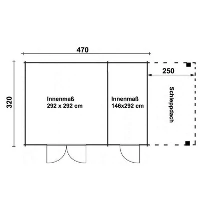 Das Alpholz Gartenhaus Modern-E Flachdach in der Farbe Natur beeindruckt mit den Abmessungen von 733 cm x 358 cm. Das Außenmaß beträgt 470 cm x 320 cm mit einem zusätzlichen seitlichen Schleppdach von etwa 250 cm. Der Sockel hat die Maße 450 cm x 300 cm. Die Seitenwandhöhe variiert zwischen ca. 211 cm und 234 cm, je nach Bereich.