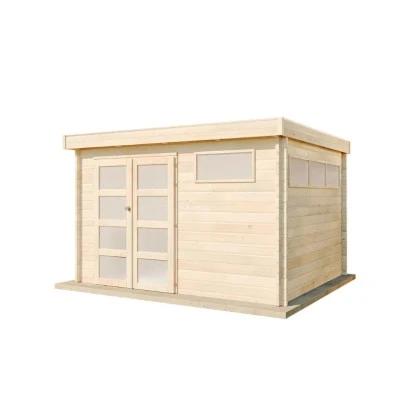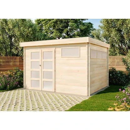 Alle Modelle haben eine Gesamthöhe von 230 cm und eine Seitenwandhöhe von 214 cm. Das Flachdach hat eine Neigung von 5° und eine Dachlast von 100 kg/m². Die Gartenhäuser sind in einer robusten Blockbohlenbauweise mit einer Wandstärke von 44 mm ausgeführt.