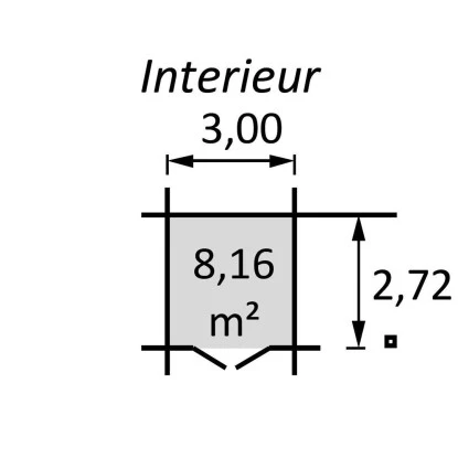Das Außenmaß inklusive Dachkranz beträgt 605 cm x 298 cm x 209 cm. Das reine Außenmaß des Gartenhauses beträgt 605 cm x 298 cm. Im Inneren des Gartenhauses beträgt das Innenmaß 300 cm x 272 cm x 190 cm. Der Rauminhalt beträgt 15,34 m³ und die Nutzfläche beläuft sich auf 8,16 m². Die Tür hat ein Durchgangsmaß von ca. 141 cm x 177 cm. Die Wandstärke des Gartenhauses beträgt 28 mm in Blockbohlenbauweise. Als Material wird naturbelassene nordische Fichte verwendet.