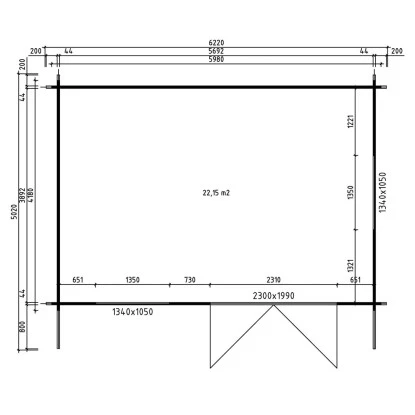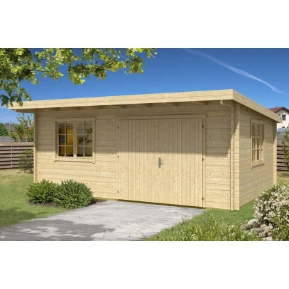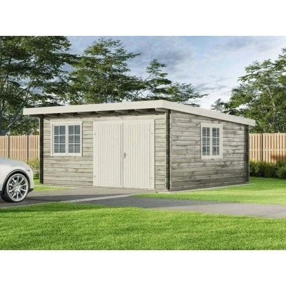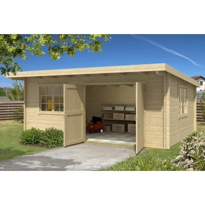 Das Blockbohlenaußenmaß beträgt 598 cm x 418 cm, während das Sockelmaß 578 x 398 cm beträgt. Die Rückwandhöhe liegt bei ca. 216 cm, und die Gesamthöhe beträgt etwa 250 cm. Die Nutzfläche des Gartenhauses beträgt ca. 22,15 m², und der Rauminhalt beläuft sich auf ungefähr 53,6 m³. Das Gartenhaus verfügt über ein großes 2-flügeliges Holzdoppeltor mit den Maßen ca. 230 cm x 199 cm. Es sind auch 2 Doppelfenster mit einer Dreh-/Kipp-Funktion vorhanden, die ca. 134 cm x 105 cm groß sind. Das Gartenhaus hat außerdem ein Vordach mit einer Tiefe von 80 cm.