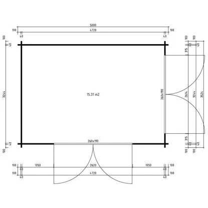 Das Gartenhaus hat ein Außenmaß von 500 cm x 352 cm und ein Sockelmaß von 480 x 332 cm. Die Grundfläche beträgt 15,31 m². Die Seitenwandhöhe des Gartenhauses beträgt ca. 217 cm, und die Gesamthöhe beträgt ca. 275 cm. Der Rauminhalt des Hauses beträgt etwa 38,2 m³. Das Walmdach hat eine Dachneigung von 20° und eine Dachfläche von 21 m². Das Gartenhaus verfügt über zwei große 4-fach Falttüren mit Vollglas, die jeweils die Maße ca. 260 cm x 190 cm haben. Die Wandstärke des Hauses beträgt 40 mm.
