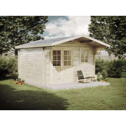 Das Gartenhaus ist in Blockbohlenbauweise aus imprägniertem Holz gefertigt. Durch die Imprägnierung wird kein weiterer Anstrich benötigt um das Haus vor Verwitterung zu schützen. Das Gartenhaus verfügt über eine stabile Konstruktion, mit einer Wandstärke von 44 mm. Das Dach des Gerätehauses ist als Satteldach gestaltet. Die Dacheindeckung ist separat erhältlich.