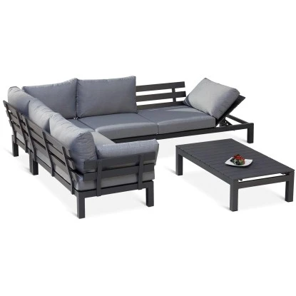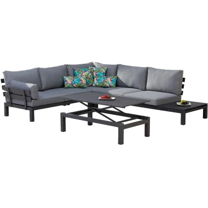 Die 4-teilige Lounge-Gruppe Manarola besteht aus 1 2-Sitzer mit Kopfverstellung, 1 geschlossenen 2-Sitzer, 1 Eckelement und 1 Tisch sowie passenden Polsterauflagen. Die Aluminiumgestelle und die Ablageflächen in leichter Lattenkonstruktion sind absolut wetterbeständig und rostfrei. Das Ablagedeck bietet Stellfläche für Utensilien und kann mit einem Handgriff hochgeklappt werden. Somit kann der 2-Sitzer zu einer komfortablen Liege umfunktioniert werden. Der Couchtisch ist höhenverstellbar von 34 cm auf 58 cm – ideal für das Dinner, das in der Lounge eingenommen wird. Die bequemen Sitz- und Rückenpolster sind mit angenehm weichem Sensotex (100 % Acryl) bezogen. Der Stoff ist wasser- und schmutzabweisend. Die Bezüge sind mit einem Reißverschluss ausgestattet und können abgezogen und gewaschen werden.