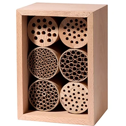 Das Bienhaus 6 ist aus FSC-zertifiziertem Buchenholz in Handarbeit gefertigt. Es stammt aus europäischer Produktion. Das Haus ist mit 3 Buchen-Holzrollen mit 7 mm breiten Bohrungen gefüllt. Außerdem beinhaltet es 3 Papprollen aus recycletem Papier aus deutscher Produktion, die widerum mit 8 mm breiten Papphülsen gefüllt sind.