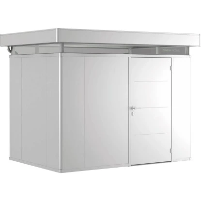 Das Gerätehaus aus Metall überzeugt durch sein ansprechendes Design und ist dabei in schlichtem Silber Metallic gehalten.