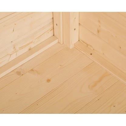 Fußboden aus 16 mm starken, naturbelassenen Holzdielen mit Nut- und Feder. Fußbodenunterkonstruktion aus chromfrei druckimprägnierten Kanthölzern mit einer Stärke von 40 mm x 40 mm. Passend für das Gartenhaus Kompakt B (200 cm x 150 cm).