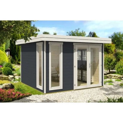 Das Gartenhaus ist aus imprägniertem Holz in Blockbohlenbauweise gefertigt. Durch die Imprägnierung wird kein weiterer Anstrich benötigt um das Haus vor Verwitterung zu schützen. Das Gartenhaus verfügt über eine robuste Konstruktion, mit einer Wandstärke von 28 mm. Die maximalen Schneelast des Flachdachs liegt bei 97 kg/m. Die Dacheindeckung ist separat erhältlich. Aufgrund der speziellen Dachform eignen sich hochwertige Dachbahnen besonders gut als Dacheindeckung.