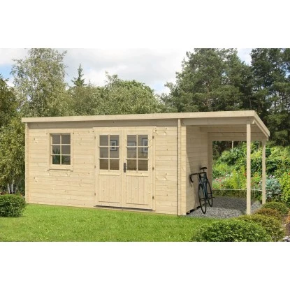 Das Gartenhaus ist aus imprägniertem Holz in Blockbohlenbauweise gefertigt. Durch die Imprägnierung wird kein weiterer Anstrich benötigt um das Haus vor Verwitterung zu schützen. Das Gartenhaus verfügt über eine robuste Konstruktion, mit einer Wandstärke von 28 mm. Das Dach des Gartenhauses ist als Flachdach gestaltet. Die Dacheindeckung ist separat erhältlich. Aufgrund der speziellen Dachform eignen sich hochwertige Dachbahnen besonders gut als Dacheindeckung.