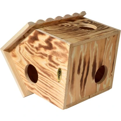 Eichhörnchen gehören zu den bekanntesten und beliebtesten einheimischen Wildtieren. Leider sind auch sie vom Verschwinden naturbelassener Landschaften betroffen. Dieser hochwertige Eichhörnchenkobel gibt Ihnen die Möglichkeit, den roten Nagetieren einen sicheren Unterschlupf und ein geeignetes Winterquartier zu geben, das sie in der Wildnis immer öfter nicht finden. Das Eichhörnchenhaus besteht aus FSC®-zertifiziertem Kiefernholz (Pinus sylvestris, Hauptholzart) aus nachhaltiger und umweltfreundlicher Forstwirtschaft. Die Oberfläche ist geflammt, wodurch eine höhere Wetterbeständigkeit erreicht und die natürliche Maserung des Holzes hervorgehoben wird. Drei Eingänge bieten den Nagern im Inneren immer genügend Fluchtwege, um hungrigen Raubtieren zu entkommen. Der Kobel sollte hoch in einem Baum und dicht am Stamm angebracht werden, um optimale Bedingungen für die Eichhörnchen zu schaffen. Die Herstellung in europäischer Produktion erfolgt in Handarbeit mit Fokus auf bester Qualität in der Verarbeitung. Die Außenmaße des Eichhörnchenkobels betragen ca. 26 x 26 x 29 cm (L x B x H).