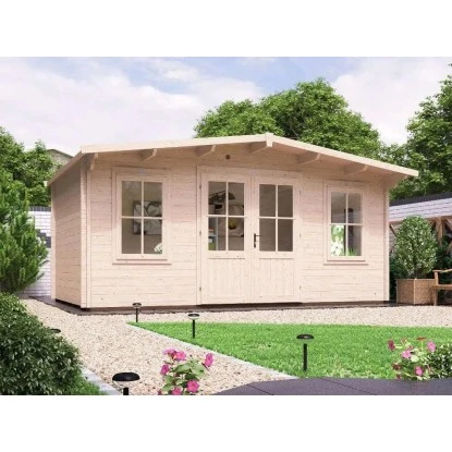 Das Gartenhaus ist aus unbehandeltem Holz in Blockbohlenbauweise gefertigt. Durch die naturbelassene Oberfläche bleibt eine natürliche Optik mit Holzmaserung erhalten. Zum Schutz vor Witterungseinflüssen sollte die Oberfläche individuell mit einer Lackierung oder Lasierung veredelt werden. Das Gerätehaus verfügt über eine stabile Konstruktion, mit einer Wandstärke von 45 mm. Das Dach des Gerätehauses ist als Satteldach gestaltet. Die Dacheindeckung ist separat erhältlich.