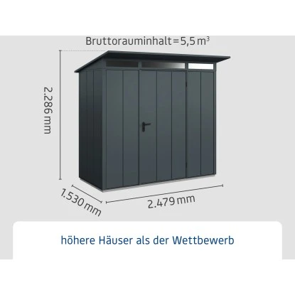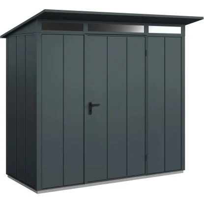 Das Gerätehaus aus Metall überzeugt durch sein ansprechendes Design und ist dabei in der Farbe Anthrazitgrau gehalten.