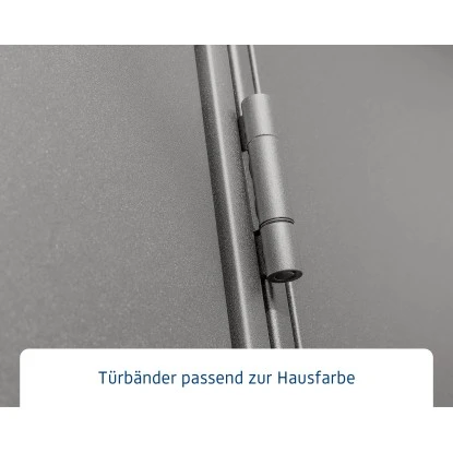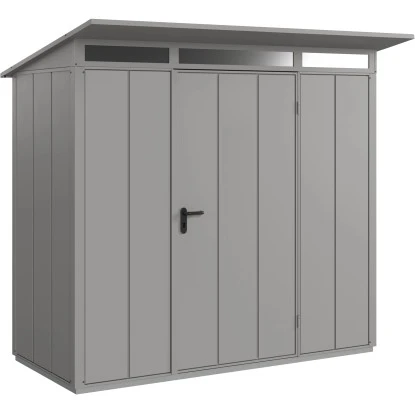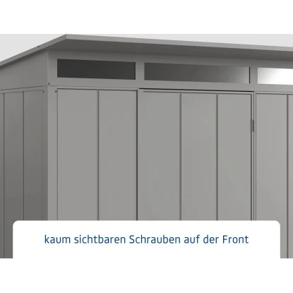 Das Gerätehaus aus Metall überzeugt durch sein modernes Design und ist dabei in schlichtem Graualuminium gehalten.