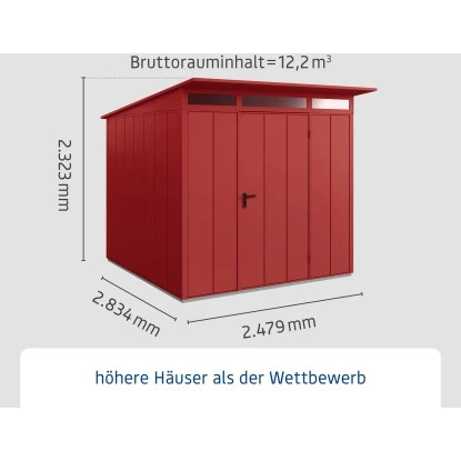 Das Gerätehaus verfügt über eine stabile Konstruktion, mit einer Wandstärke von 0,65 mm. Die maximalen Schneelast des Pultdachs liegt bei 150 kg/m. Die Firsthöhe beträgt 232,3 cm, wodurch eine angenehme Kopffreiheit im Innenraum gegeben ist. Die Oberfläche des Metall-Gerätehauses ist pulverbeschichtet, feuerverzinkt, um es optimal vor Witterungseinflüssen zu schützen und Korrosion vorzubeugen.
