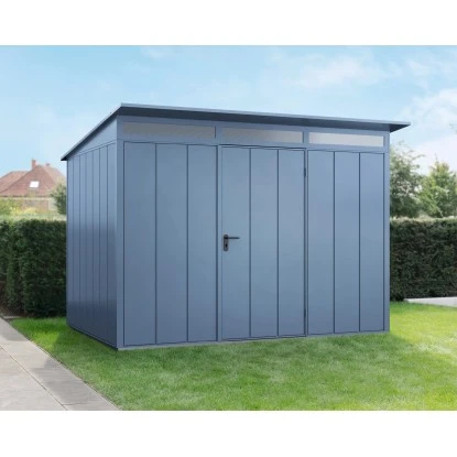 Das Haus verfügt über eine stabile Konstruktion, mit einer Wandstärke von 0,65 mm. Die maximalen Schneelast des Pultdachs liegt bei 150 kg/m. Die Firsthöhe beträgt 232,3 cm, wodurch eine angenehme Kopffreiheit im Innenraum gegeben ist. Die Oberfläche des Metall-Gerätehauses ist pulverbeschichtet, feuerverzinkt, um es optimal vor Witterungseinflüssen zu schützen und Korrosion vorzubeugen.