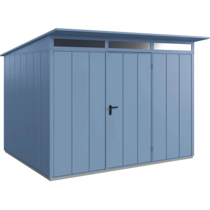 Das Metall-Gerätehaus überzeugt durch sein ansprechendes Design und ist dabei in der Farbe Taubenblau gehalten.