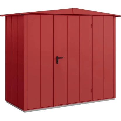 Das Gerätehaus verfügt über eine robuste Konstruktion, mit einer Wandstärke von 0,65 mm. Die maximalen Schneelast des Satteldachs liegt bei 150 kg/m. Die Firsthöhe beträgt 216 cm, wodurch eine angenehme Kopffreiheit im Innenraum gegeben ist. Die Oberfläche des Metall-Gerätehauses ist pulverbeschichtet, feuerverzinkt, um es optimal vor Witterungseinflüssen zu schützen und Korrosion vorzubeugen.