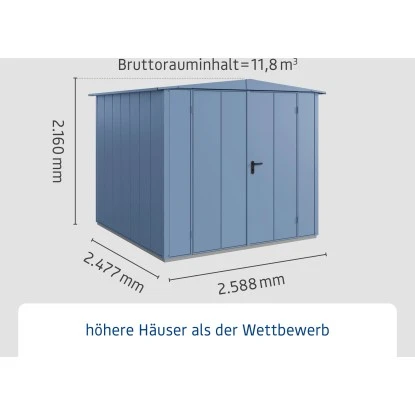 Das Gerätehaus verfügt über eine stabile Konstruktion, mit einer Wandstärke von 0,65 mm. Die maximalen Schneelast des Satteldachs liegt bei 150 kg/m. Die Firsthöhe beträgt 216 cm, wodurch eine angenehme Kopffreiheit im Innenraum gegeben ist. Die Oberfläche des Metall-Gerätehauses ist pulverbeschichtet, feuerverzinkt, um es optimal vor Witterungseinflüssen zu schützen und Korrosion vorzubeugen.