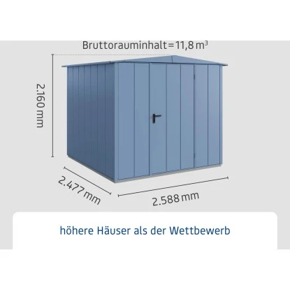Das Gerätehaus verfügt über eine stabile Konstruktion, mit einer Wandstärke von 0,65 mm. Die maximalen Schneelast des Satteldachs liegt bei 150 kg/m. Die Firsthöhe beträgt 216 cm, wodurch eine angenehme Kopffreiheit im Innenraum gegeben ist. Die Oberfläche des Metall-Gerätehauses ist pulverbeschichtet, feuerverzinkt, um es optimal vor Witterungseinflüssen zu schützen und Korrosion vorzubeugen.