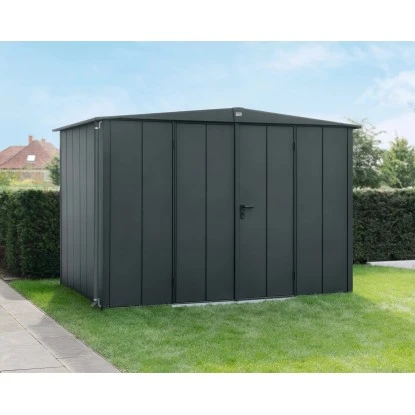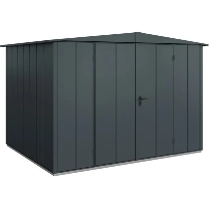 Das Metall-Gerätehaus überzeugt durch sein ansprechendes Design und ist dabei in schlichtem Anthrazitgrau gehalten.