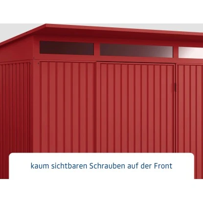 Das Haus verfügt über eine robuste Konstruktion, mit einer Wandstärke von 0,5 mm. Die maximalen Schneelast des Pultdachs liegt bei 150 kg/m. Die Firsthöhe beträgt 228,6 cm, wodurch eine angenehme Kopffreiheit im Innenraum gegeben ist. Die Oberfläche des Metall-Gerätehauses ist pulverbeschichtet, feuerverzinkt, um es optimal vor Witterungseinflüssen zu schützen und Korrosion vorzubeugen.