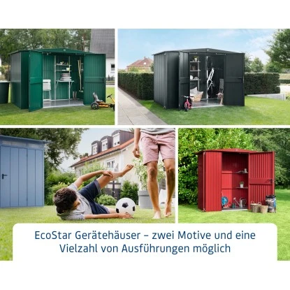 Das EcoStar Metall-Gerätehaus ist platzsparend gestaltet mit einer Grundfläche von 2,6 m². Das ansprechende Gerätehaus aus Metall eignet sich besonders zur Aufbewahrung von Gegenständen. Der breite Eingang ermöglicht ein einfaches Betreten des Holz-Gartenhauses, auch mit größeren Geräten, Gartenutensilien, Fahrrädern und Gartenmöbeln. Es bietet eine Durchgangsbreite von 96,9 cm und eine Durchgangshöhe von 194 cm.