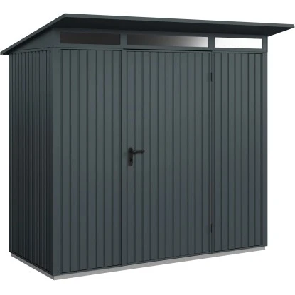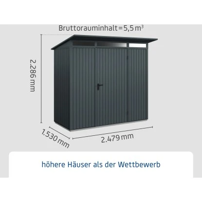 Das Haus verfügt über eine stabile Konstruktion, mit einer Wandstärke von 0,5 mm. Die maximalen Schneelast des Pultdachs liegt bei 150 kg/m. Die Firsthöhe beträgt 228,6 cm, wodurch eine angenehme Kopffreiheit im Innenraum gegeben ist. Die Oberfläche des Metall-Gerätehauses ist pulverbeschichtet, feuerverzinkt, um es optimal vor Witterungseinflüssen zu schützen und Korrosion vorzubeugen.