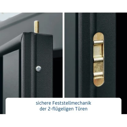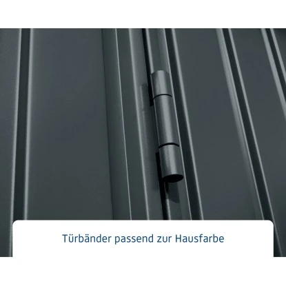 Das Metall-Gartenhaus überzeugt durch sein klassisches Design und ist dabei in der Farbe Anthrazitgrau gehalten.