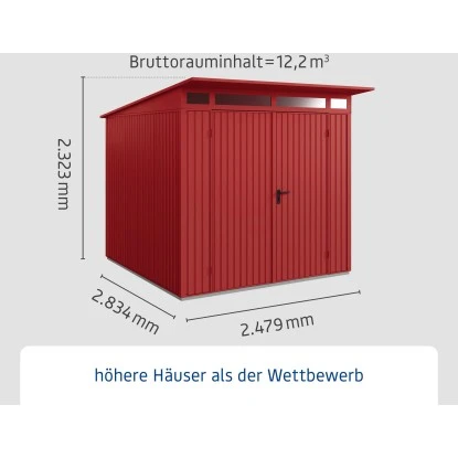 Das EcoStar Metall-Gerätehaus ist platzsparend gestaltet mit einer Grundfläche von 5,7 m². Das ansprechende Gerätehaus aus Metall eignet sich besonders zur Aufbewahrung von Gegenständen. Der breite Eingang ermöglicht ein einfaches Betreten des Holz-Gartenhauses, auch mit größeren Geräten, Gartenutensilien, Fahrrädern und Gartenmöbeln. Es bietet eine Durchgangsbreite von 159,6 cm und eine Durchgangshöhe von 194 cm.