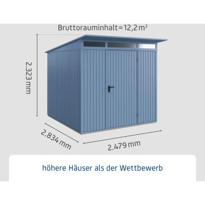 Das Gerätehaus aus Metall überzeugt durch seine ansprechende Optik und ist dabei in schlichtem Taubenblau gehalten.