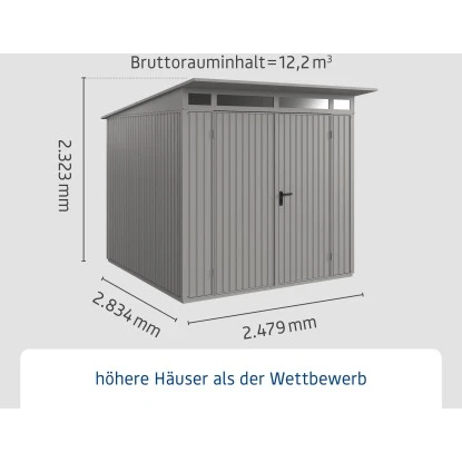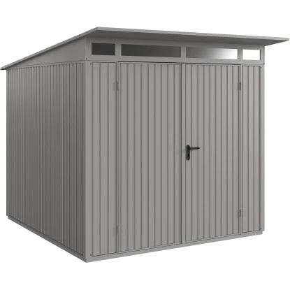 Das Gerätehaus aus Metall überzeugt durch sein ansprechendes Design und ist dabei in der Farbe Graualuminium gehalten.