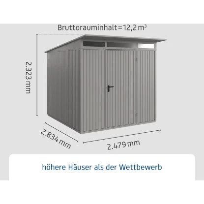 Das Metall-Gerätehaus überzeugt durch sein ansprechendes Design und ist dabei in schlichtem Graualuminium gehalten.