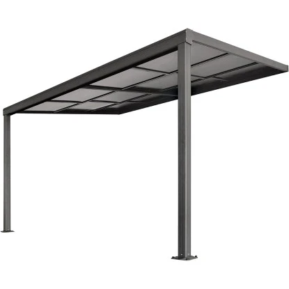 Die Floraworld Terrassenüberdachung Air in der Farbe Anthrazit ist aus einem stabilen Aluminium-Rahmen hergestellt und pulverbeschichtet. Inklusive sind Schiebedach mit Kunststoff-Doppelstegplatten und UV-Schutz. Die 2 Standfüße besitzen ein integriertes Wasserablaufsystem.