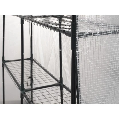 Das Folien-Gewächshaus besitzt ein robustes und lackiertes Metallgestänge. Es ist mit 8 Draht-Regalböden ausgestattet, die eine Größe von ca. 54 x 28cm besitzen und bis ca. 20 kg belastbar sind. Der Überwurf besteht aus einer strapazierfähigen PE-Folie, die UV-beständig ist. Als Zubehör sind 8 Erdspieße und 4 PE-Seile zur Stabilisierung beigefügt. Der Eingang ist nach oben aufrollbar und mit einer Klettverschluss-Befestigung versehen. Die Fenstergröße des Eingangs hat eine Abmessung von ca. 86 x 145cm.