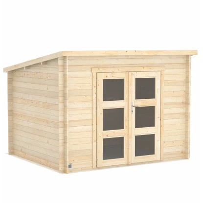 Das Gartenhaus ist aus unbehandeltem Holz im Steck- & Schraubsystem gefertigt. Durch die naturbelassene Oberfläche bleibt eine natürliche Optik mit Holzmaserung erhalten. Zum Schutz vor Witterungseinflüssen sollte die Oberfläche individuell mit einer Lackierung oder Lasierung veredelt werden. Für die Montage der Gartenlaube müssen Sie kein Profi-Handwerker sein. Dank des praktischen Steck-Schraubsystems kann die Montage problemlos durchgeführt werden und die einzelnen Teile lassen sich einfach verbinden. Das Haus verfügt über eine stabile Konstruktion, mit einer Wandstärke von 28 mm. Die maximalen Schneelast des Pultdachs liegt bei 100 kg/m. Die Dacheindeckung ist separat erhältlich.