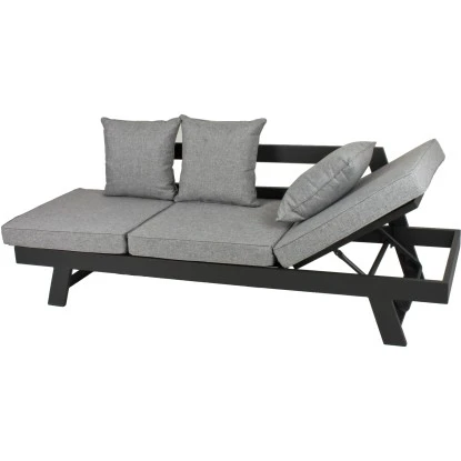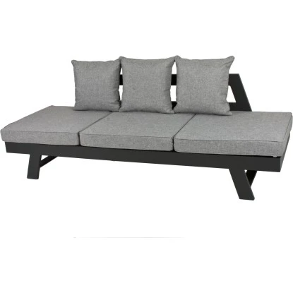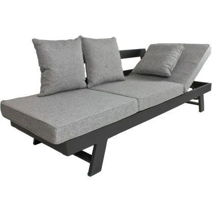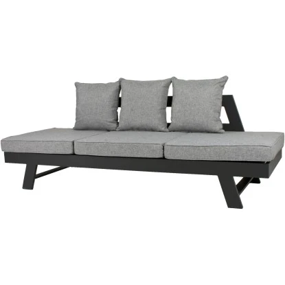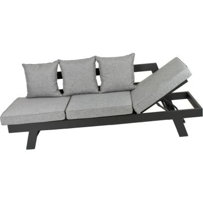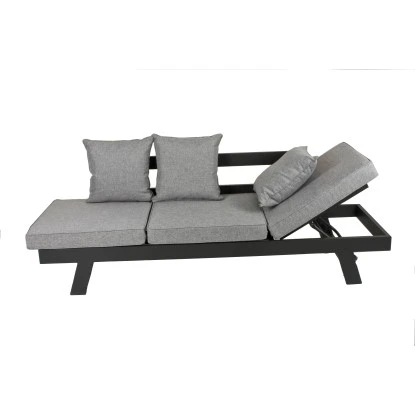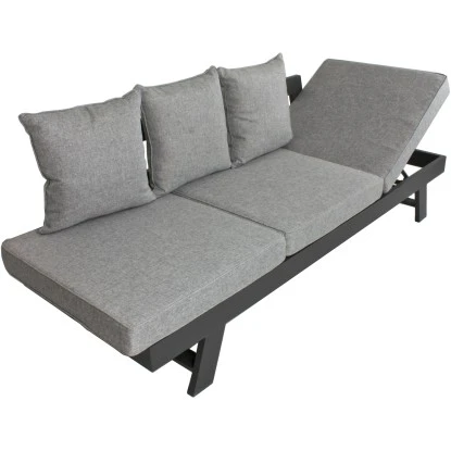 Das Garden Pleasure Funktionssofa Donna besteht aus einem pulverbeschichtetem, anthrazitfarbigem Aluminiumgestell und den Rücken- bzw. Sitzkissen. Die äußeren Sitzflächen sind mit einer Verstellvorrichtung versehen, so dass sie stufenweise aufgestellt werden können. So lässt sich ganz einfach eine bequeme Sitz- oder Liegeposition finden.