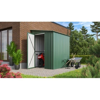 Das Metall-Gerätehaus überzeugt durch sein ansprechendes Design und ist dabei in schlichtem Jade gehalten.