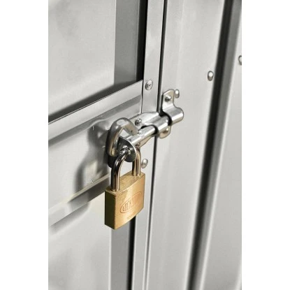 Mit dem globel Schwingtür-Kit 1 für Metallgerätehäuser lässt sich eine zusätzliche Einzeltür im Gerätehaus einbauen. Die Zusatz-Tür in Silber Metallic ist kompatibel mit den globel Metallgerätehäusern 8×8, 10×8, 10×10, 6×4 und 6×5.
