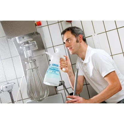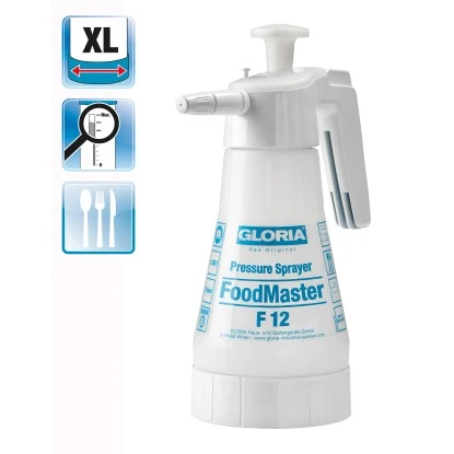 Das Gloria Drucksprühgerät FoodMaster F12 ist bedenkenlos für den Einsatz in Betrieben, die täglich mit Lebensmitteln arbeiten, geeignet. Der Spezial-Drucksprüher wurde von der Eurofins Food Testing GmbH, einer international führenden Labor-Gruppe im Bereich der Analyse-Leistungen für die Lebensmittel- und Konsumgüterindustrie, hinsichtlich des Einsatzes in lebensmittelverarbeitenden Betrieben entsprechend geprüft und freigegeben. Mit einem Füllinhalt von 1,25 l und einem maximalen Betriebsdruck von 3 bar ist der F12 der ideale Helfer, wenn es um die Desinfektion und Reinigung von Produktionsanlagen, Großküchen oder Kantinen geht. Zudem ist das Drucksprühgerät zur Ausbringung von Lebensmitteln wie Fetten oder Ölen bedenkenlos geeignet.