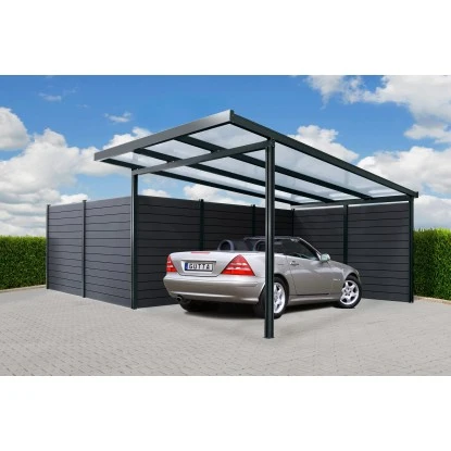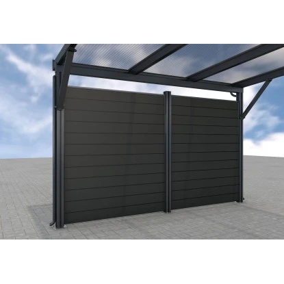 Mit der Rückwand aus dunkelgrauen WPC-Dielen lässt sich das Carport Premium anthrazit erweitern.