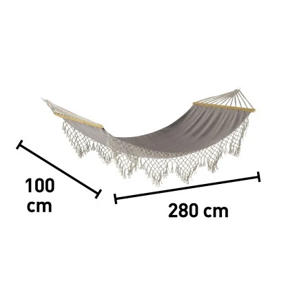 Das Tuch besteht aus strapazierfähigem, witterungsbeständigem und pflegeleichtem Polycotton. In den Schmalseiten sind robuste Spreißstäbe aus FSC®-zertifiziertem Schima-Holz integriert, welche die Matte auf Spannung halten. Das flexible Tuchmaterial ermöglicht Ihnen komfortable Sitz- und Liegepositionen, da es sich individuell Ihrer Körperform anpasst. Mit den Maßen 100 cm x 280 cm (B x T) steht Ihnen eine großzügige Liegefläche zur Verfügung. Dank der Seilaufhängung mit Ösen lässt sich die Hängematte einfach zwischen zwei Bäumen, stabilen Pfählen oder Ständern aufhängt werden. Die Sonnenliege wird ohne Zubehör komplett montiert geliefert, sodass Sie sich direkt hineinlegen können.
