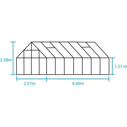 Für eine optimale Belüftung und Luftzirkulation können Sie die vier Dachfenster aufstellen und somit effektiv einem Hitzestau in Ihrem Gewächshaus entgegenwirken. Zum Lüften ist auch die leichtgängige Doppelschiebetür geeignet. Die Schiebetür verläuft innerhalb der Profilrahmen, sodass überstehende Schienen vermeiden werden. Sie benötigt nur wenig Platz und hat eine Durchgangsbreite von ca. 116 cm. Auf der Grundfläche von 11,5 m² bietet es viel Platz für Hobbygärtner und es bleibt zudem genügend Platz um mit Hochbeeten auf verschiedenen Ebenen zu Gärtnern. Das Halls Magnum Gewächshaus ist in drei Farben erhältlich – Alu-Natur, Grün oder Schwarz.