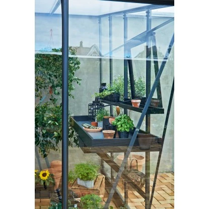 Die integrierten Gewächshaustische von Juliana bieten eine funktionelle Arbeitsfläche, die nicht zu viel Platz einnimmt. An der Unterseite des Tisches befindet sich eine Schublade zur Aufbewahrung von Werkzeug, Samen und Ähnlichem. Das schicke Design harmoniert gut mit den neuen Gewächshausserien von Juliana.