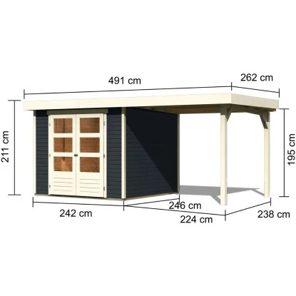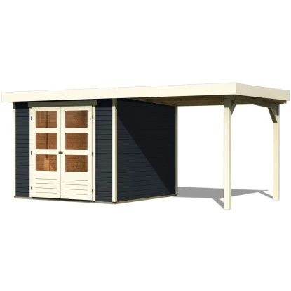 Das Holz-Gartenhaus überzeugt durch sein modernes Design und ist dabei in der Farbe Anthrazit gehalten. Es eignet sich zum Verweilen, als Gartenpavillon, Geräteschuppen oder Freizeithaus.