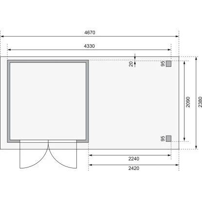 Das Karibu Gartenhaus aus Holz ist großzügig gestaltet mit einer Grundfläche von 9,1 m². Es bietet eine Durchgangsbreite von 139 cm und eine Durchgangshöhe von 175 cm. Der breite Eingang ermöglicht einen einfachen Zugang des Holz-Gartenhauses, auch mit größeren Geräten, Gartenutensilien, Fahrrädern und Gartenmöbeln. Die Firsthöhe beträgt 211 cm, wodurch eine angenehme Kopffreiheit im Innenraum gegeben ist. Der Boden ist separat erhältlich.