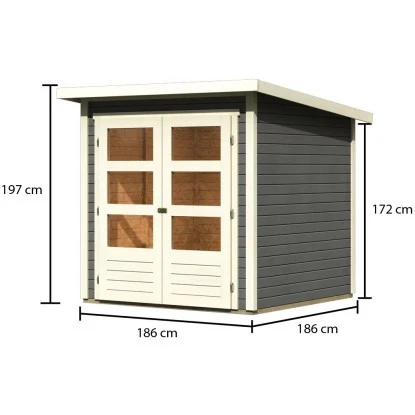 Das Karibu Gartenhaus aus Holz ist kompakt gestaltet mit einer Grundfläche von 3,31 m². Es bietet eine Durchgangsbreite von 139 cm und eine Durchgangshöhe von 162 cm. Der breite Eingang ermöglicht ein einfaches Betreten des Holz-Gartenhauses, auch mit größeren Geräten, Gartenutensilien, Fahrrädern und Gartenmöbeln. Die Firsthöhe beträgt 197 cm, wodurch eine angenehme Kopffreiheit im Innenraum gegeben ist. Der Boden ist bereits im Lieferumfang enthalten.