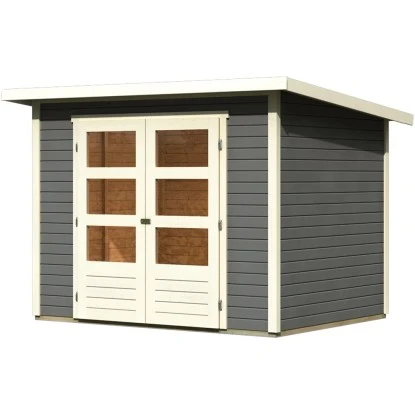 Das Gartenhaus aus Holz überzeugt durch sein modernes Design und ist dabei in der Farbe Terragrau gehalten. Es eignet sich für den universellen Einsatz als Geräteschuppen, Gartenpavillon oder Freizeithaus.