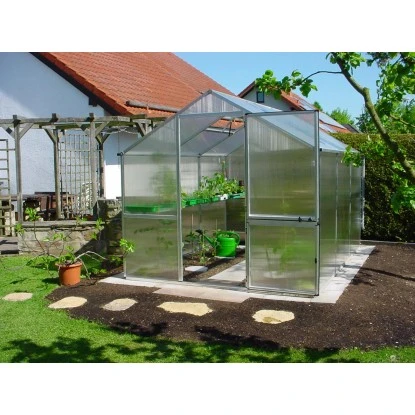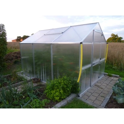 Das Gewächshaus verfügt über eine stabile Grundkonstruktion mit sicherer Steck-Schraub-Verbindungstechnik. Die transparenten, besonders wärmeisolierenden 10 mm ISO-Hohlkammerplatten aus bruchfestem Polycarbonat bieten umfassenden Schutz für Ihre Bepflanzung. Ein Longlife-UV-Schutz sorgt dafür, dass Vergilbungen durch UV-Strahlung entgegengewirkt werden.