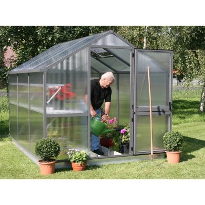 Das KGT Gewächshaus Tulpe mit Satteldach bietet dank der dicken Verglasung beste Isoliereigenschaften zum Überwintern Ihrer frostempfindlichen Pflanzen. Neben der breiten geteilten, abschließbaren Drehtür und dem Rückwandfenster mit Handaufsteller verfügt das Gewächshaus zusätzlich über ein Dachfenster mit automatischem Fensterheber, damit eine optimale Be- und Entlüftung Ihrer Pflanzen gewährleistet wird. Die stabile Aluminium-Konstruktion sowie die transparenten, extra wärmeisolierenden 16 mm-starken ISO-Hohlkammerplatten aus hochbruchfestem Polycarbonat sorgen für beste Stabilität. Beidseitige Regenrinnen mit Fallrohren sind ebenso vorhanden. Das Haus eignet sich hervorragend für den anspruchsvollen Gärtner zur Anzucht von Pflanzen und Gemüse sowie zum heizkostensparenden Überwintern von Pflanzen.